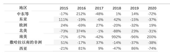 并非所有地区的“一带一路”投资下降都是均匀的。西亚和东亚呈显著降幅,但“一带一路”在欧洲的相关投资有所增长,且在南美的相关投资增长强劲。(与2019年的低水平增长相比)。