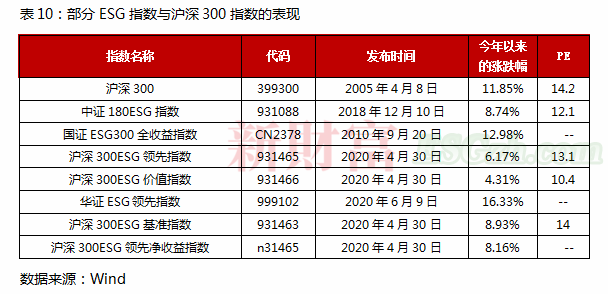 将ESG指数今年以来的收益表现与沪深300指数进行对比,可以发现,国证ESG300全收益指数收益率为12.98%,华证ESG领先指数的收益率为16.33%,表现高于沪深300指数的11.85%,其余大部分ESG指数的表现均不如沪深300指数。其原因或在于,大多数国内ESG指数样本时间较短,ESG评价体系和标的选取机制还不成熟(表10)。