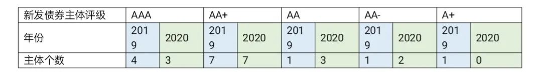 表7 2019与2020年新发债券主体评级的统计