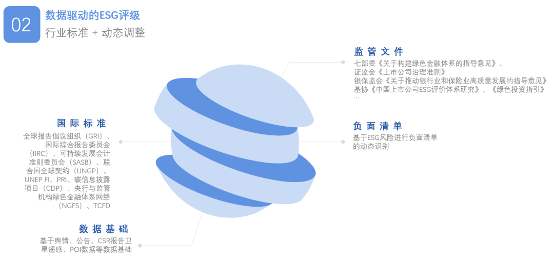 其次,基于数据基础和技术能力,可以综合形成数据驱动的ESG评级体系。这套体系是基于监管文件、国际标准、数据基础和负面清单所构建出的准实时更新的ESG评级体系(如图),能对公司做出更加客观、全面的评估。