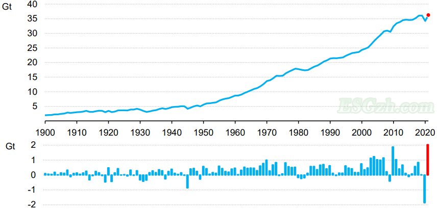 图说:1900-2021 年能源燃烧和工业过程产生的二氧化碳排放量及年度变化量