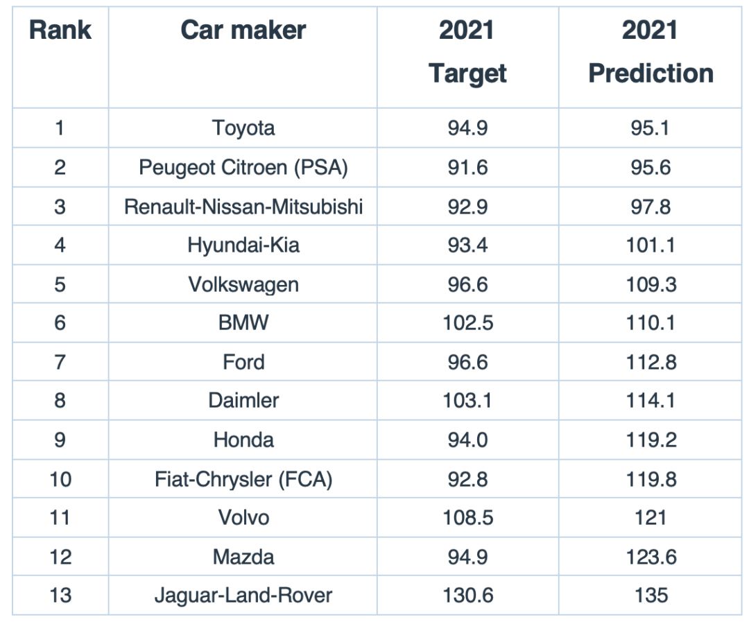 文章最后,我们把欧盟境内最主要的13家车企在2021年二氧化碳排放达标的预测排名分享给大家。