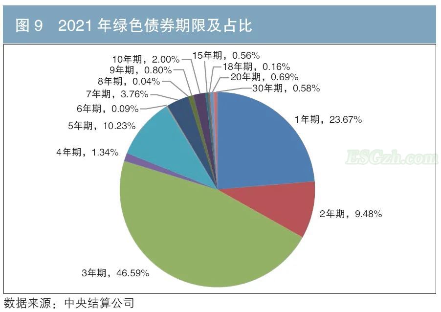 在2016年发行的绿色债券中,3年期和5年期的合计占比高达93%。2017年至今,发行期限逐渐多元化(见图8)。2021年,绿色债券期限以1年期、3年期和5年期为主,并出现20年期以上的长期限绿色债券;3年期以下绿色债券占比增长至33%,有效缓解了疫后绿色项目短期流动性不足的问题(见图9)。