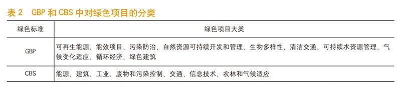 一是国际标准。以绿色债券原则(GBP)、气候债券认证(CBS)为例。绿色债券原则(Green Bond Principle,GBP)是由绿色债券发行人、投资机构和承销商组成的绿色债券原则执行委员会与国际资本市场协会(ICMA)合作推出的,该原则的目的是增强绿色债券信息披露透明度、促进绿债市场健康发展。气候债券标准(Climate Bond Standard,CBS)由气候债券倡议组织(Climate Bond Initiative,CBI)开发,在GBP的基础进行细化,旨在给出具体可操作的指导方案,在行业层面上界定什么是绿色。CBS划分了八类项目,主要包括能源、建筑、工业、废物和污染控制、交通、信息技术、农林和气候适应(见表2)。GBP和CBS是目前国际市场上接受度最高的绿色债券标准,在推动绿色债券市场透明度方面发挥了重要作用,但上述标准同时也存在分类不够细致和不够明确等问题。