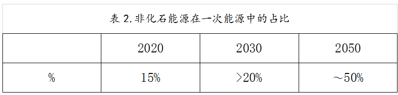 根据已有的国家能源发展规划,以可再生能源为主的非化石能源在一次能源中占比的变化如表2。