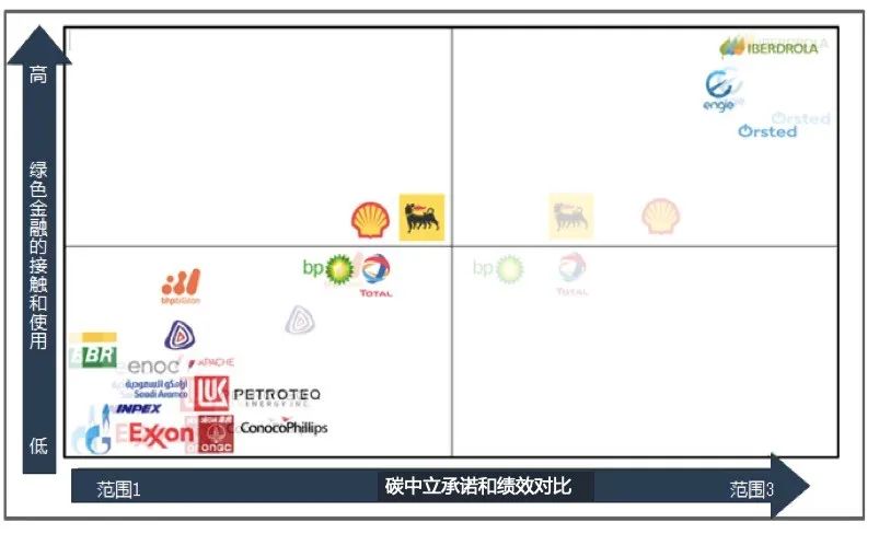 图2显示了图1中公司的可持续发展进程。该图将他们的气候绩效(而非承诺)与外部披露和内部绿色金融使用情况进行了比较。结果符合TPI的分析:大多数做出重大承诺的公司在实际业绩方面仍然落后。图3将图1和图2进行比较,可以清晰的看出这一趋势。