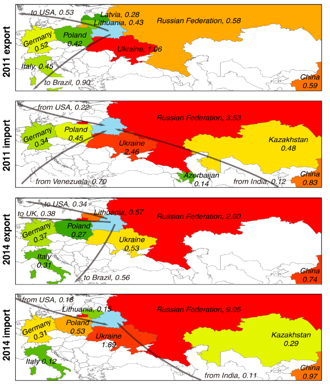 2011年,白俄罗斯生产端碳排放为50.59Mt,消费端碳排放为48.26Mt,是碳排放净出口国;2014年,白俄罗斯转变为碳排放净进口国,碳排放净进口为3.78Mt。白俄罗斯主要贸易国的贸易隐含碳排放量如图5所示。2011年,乌克兰是该国最大的隐含碳出口国。在和乌克兰的国际贸易中,白俄罗斯承担了大量的二氧化碳排放(近200万吨)。与白俄罗斯关系密切的中国和俄罗斯紧随其后。2014年,俄罗斯是该国最大的隐含碳进口国,通过从俄罗斯进口,白俄罗斯避免了大量的二氧化碳排放。总体而言,白俄罗斯在2014年后将更多的排放通过贸易转移到了其他国家。