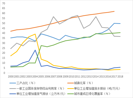 图1 2000年-2018年内蒙古自治区部分经济生态化指标趋势图