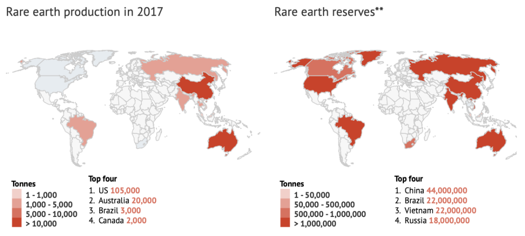 美国地质勘探局的数据显示,到目前为止,中国是稀土的主导力量,供应年13万吨稀土的80%。中国拥有约44万吨稀土储量,约为目前已知储量的三分之一。在稀土元素的加工和供应链中也占据主导地位,实现供应多样化可能需要几十年的时间。