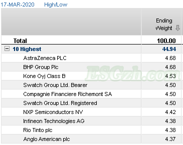 新兴指数中排名前10位的证券占该指数的44.94%,而标准MSCI指数中该指数仅占21.60%,必和必拓集团和阿斯利康在我们的再平衡指数中的权重最高: