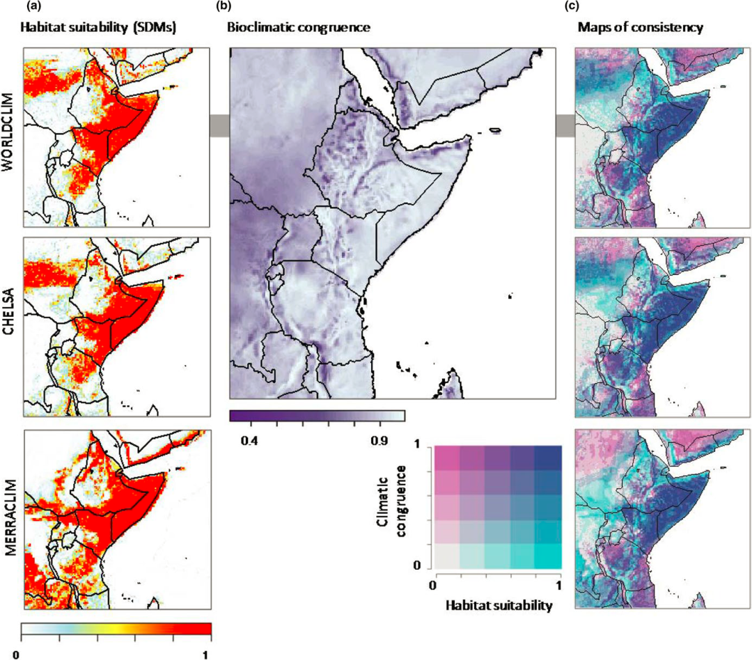 图4 生物气候一致性方法的研究实例:Litocranius walleri。基于WorldClim v. 2,MERRAclim, 和 CHELSA 物种分布模型构建(a)栖息地适宜性图,(b)全球生物气候一致性图,最终得到(c)耦合二者的生物气候学一致性图。